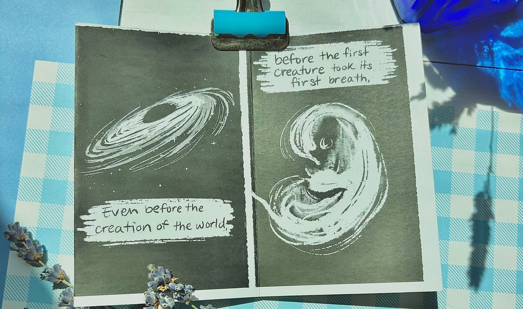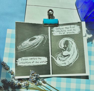 One day in July 2024, as I was in my small apartment seeking refuge from the Rogue Valley heat, I had a moment of inspiration. Stemming from a video I saw on Instagram about the sound that our diaphragm makes (sounds like YHWH, if you were curious), I sat down at my desk and drafted out a small zine (a play on 'magazine' and typically a short art-based booklet). After I had my draft, I pulled out my iPad and drew a final version, printed it, put it together, and showed my husband.
